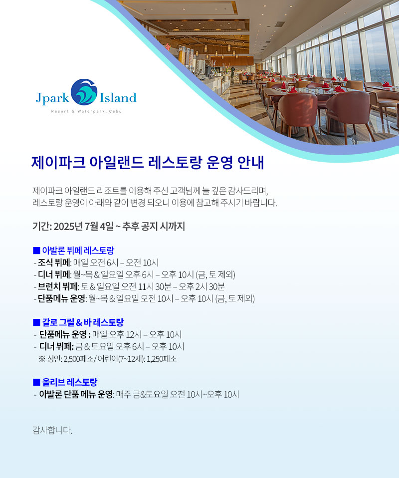 제이파크 아일랜드 레스토랑 운영 변경 안내